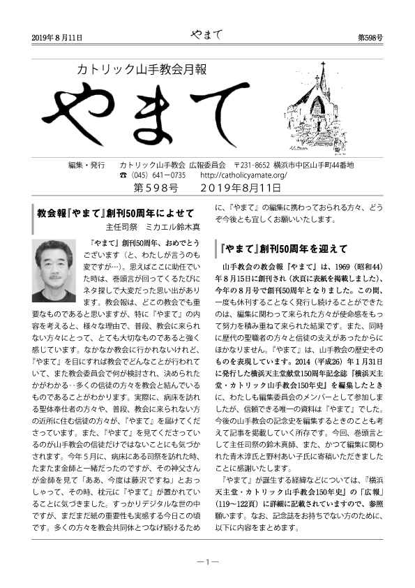 カトリック山手教会月報 『やまて』 第598号 2019年8月11日 by HomePage Administrator 教会報やまて 『やまて』 第598号 目次 巻頭(PDF) 教会報『やまて』創刊50周年によせて 主任司祭 ミカエル鈴木真 『やまて』創刊50周年を迎えて 2ページ 『やまて』創刊号 3ページ 教会報『やまて』の思い出 4ページ 創刊50周年によせて 第63回湘南地区聖歌隊交歓会 5ページ AOS研修に参加して学んだこと ボーイスカウト横浜第34団 社会貢献活動 6ページ ~手を取り合って~ ロザリオ会からのお知らせ 教会委員会議事録より 7ページ 伝言板 8ページ 2019年8月・9月主日ミサの聖歌および奉仕者予定表 編集後記 巻頭以降のページについては、カトリック山手教会にて配布しておりますカトリック山手教会月報『やまて』をお読みください。 Share