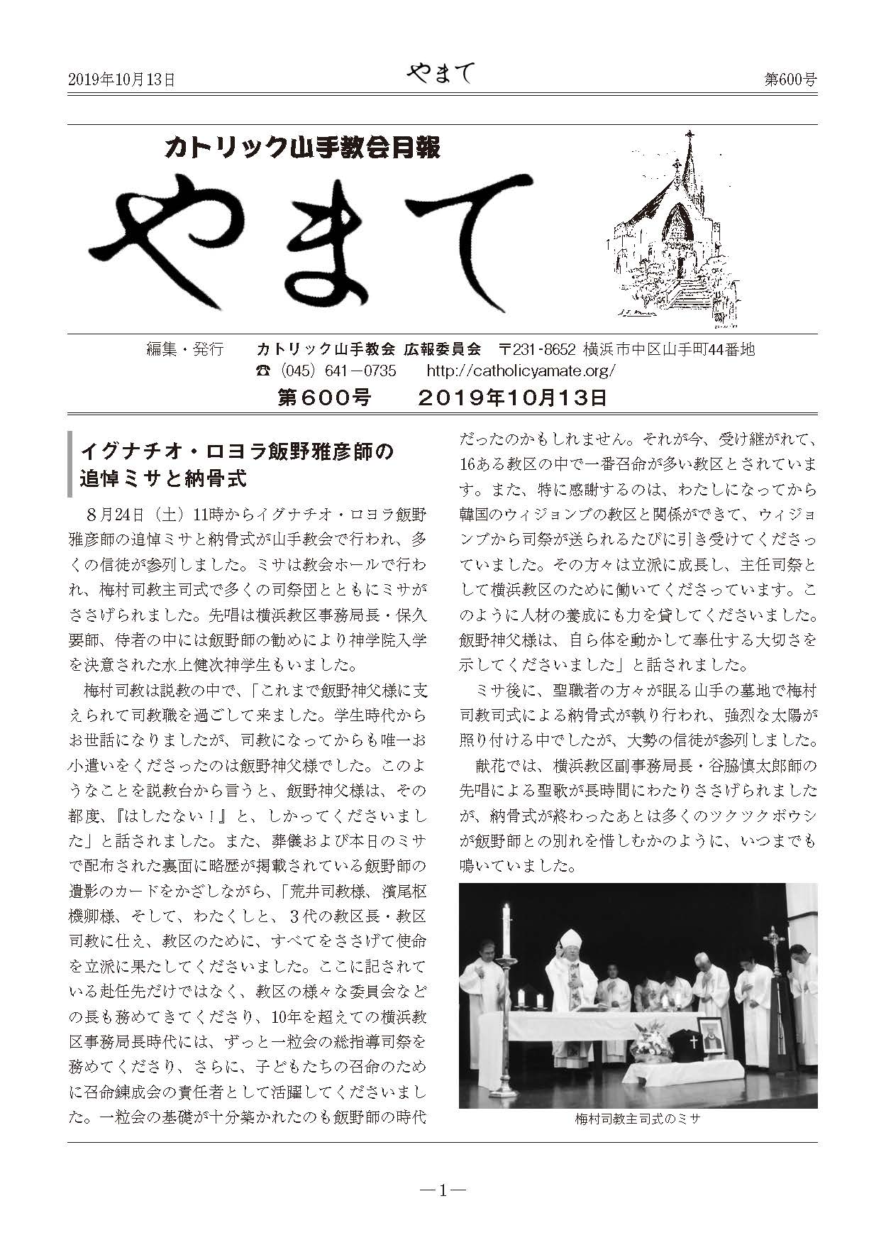 カトリック山手教会月報 『やまて』 第600号 2019年10月14日 by HomePage Administrator 教会報やまて 『やまて』 第600号 目次 巻頭(PDF) イグナチオ・ロヨラ飯野雅彦師の追悼ミサと納骨式 2ページ 病者の塗油 3ページ ヨゼフ会黙想会2019 神山復生病院を訪ねて 4ページ 横浜市麦田地域ケアプラザへ はじめての高校生大会 5ページ ~手を取り合って~ ロザリオ会からのお知らせ 笑顔 6ページ 9月教会委員会議事録より 7ページ 伝言板 8ページ 2019年10月・11月主日ミサの聖歌および奉仕者予定表 編集後記 巻頭以降のページについては、カトリック山手教会にて配布しておりますカトリック山手教会月報『やまて』をお読みください。 Share