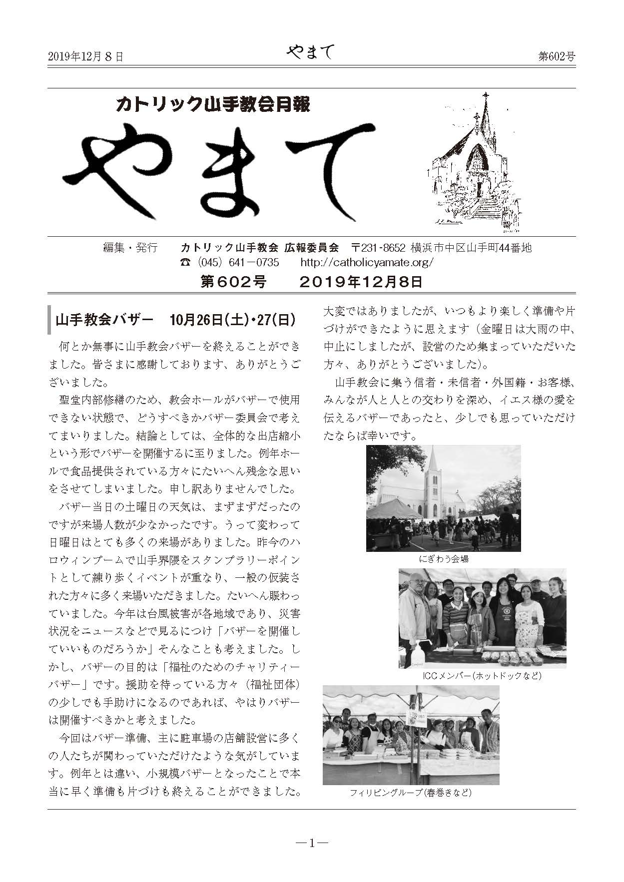 カトリック山手教会月報 『やまて』 第602号 2019年12月8日 by HomePage Administrator 教会報やまて 『やまて』 第602号 目次 巻頭(PDF) 山手教会バザー 10月26日(土)・27(日) 3ページ 教会学校の子どもたちの演奏会 七五三の祝福 4ページ カトリック山手教会 聖堂修復支援コンサート 東京カトリック神学院ザビエル祭 5ページ ~手を取り合って~ ロザリオ会からのお知らせ 6ページ 11 月教会委員会議事録より 7ページ 伝言板 8ページ 2019年12月・2020年1月主日ミサの聖歌および奉仕者予定表 編集後記 巻頭以降のページについては、カトリック山手教会にて配布しておりますカトリック山手教会月報『やまて』をお読みください。 Share