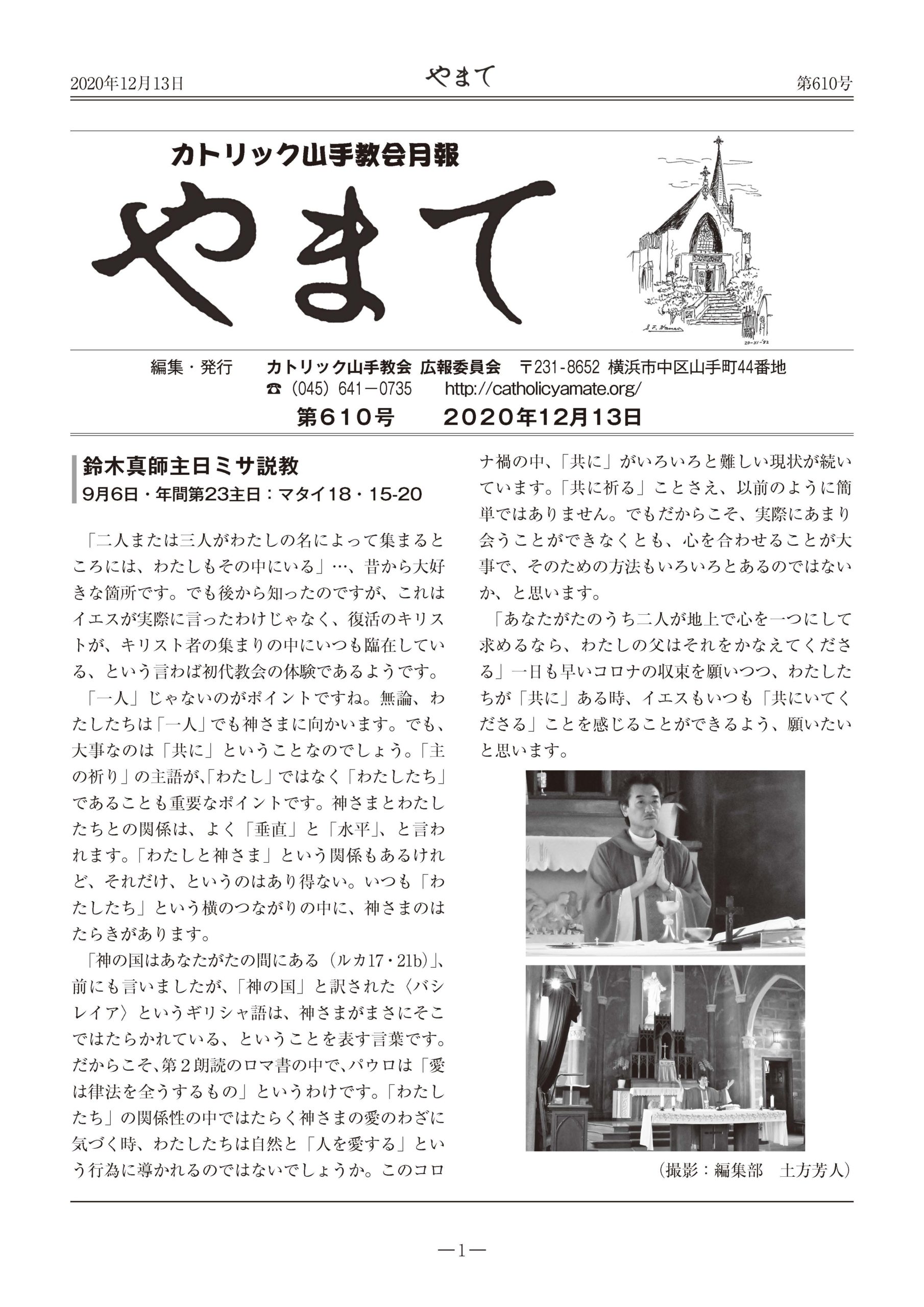 カトリック山手教会月報 『やまて』 第610号 2020年12月13日 by HomePage Administrator 教会報やまて 『やまて』 第610号 目次 巻頭(PDF) 鈴木真師主日ミサ説教 9月6日・年間第23主日 2ページ 教会学校、洗礼・初聖体ミサ 3ページ 七五三の祝福 帰天者の追悼ミサ 4ページ 各種講座が再開されました 5ページ 子どもたちと見守る大人が一緒に暮らす- -『子どもの村東北』を訪ねて 6ページ ~手を取り合って~ロザリオ会からのお知らせ 2020年11月度教会委員会議事録 8ページ 2020年12月・2021年1月主日ミサの聖歌および奉仕者予定表 編集後記 Share
