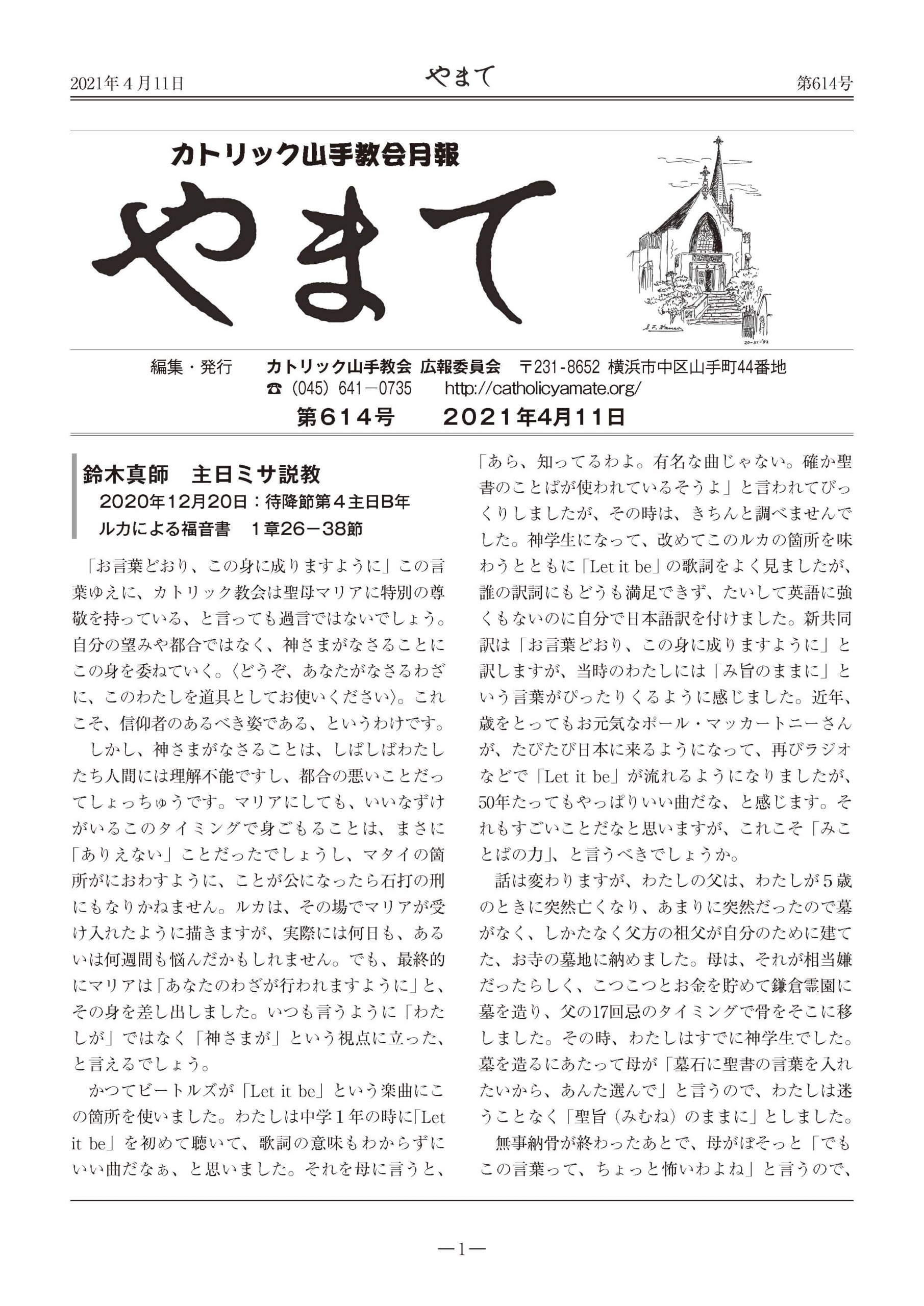 カトリック山手教会月報 『やまて』 第614号 2021年4月11日 by HomePage Administrator 教会報やまて 『やまて』 第614号 目次 巻頭(PDF) 鈴木真師 主日ミサ説教 2020年12月20日:待降節第4主日 2021年1月10日:主の洗礼B年 3ページ 教会学校の卒業式 2021年(令和3年)度・中高生会 4ページ 合葬墓建設工事に伴う立ち入り禁止について (寄稿)「エベレスト街道」トレッキングの思い出 6ページ 2021年3月度教会委員会議事録 8ページ 2021年4月・5月主日ミサの聖歌および奉仕者予定表 編集後記 Share