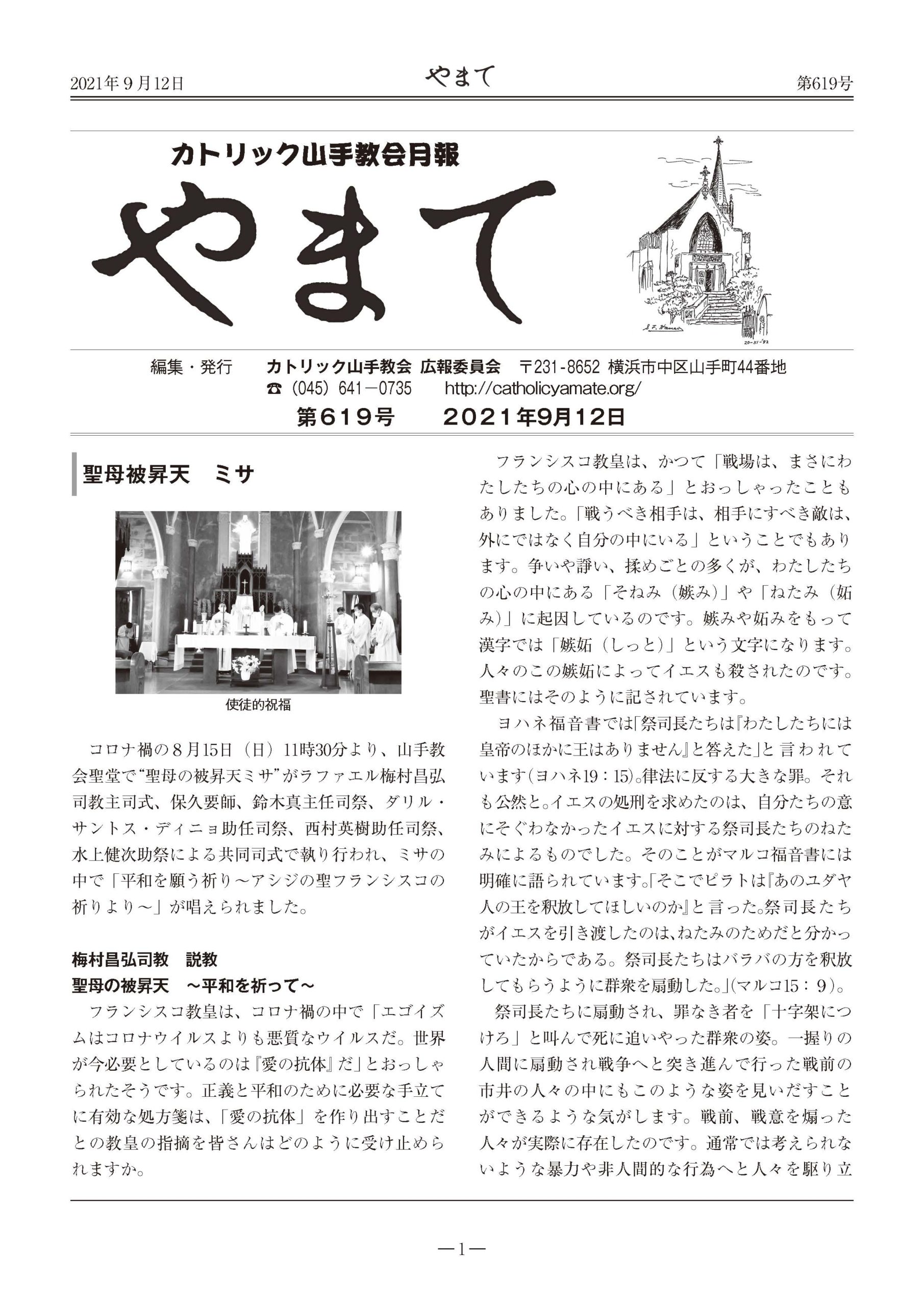 カトリック山手教会月報 『やまて』 第619号 2021年9月12日 by HomePage Administrator 教会報やまて 『やまて』 第619号 目次 巻頭(PDF) 聖母被昇天 ミサ 梅村昌弘司教 説教 聖母の被昇天 ~平和を祈って~ 2ページ 司祭の横顔に近づく!インタビュー企画② 助任司祭 ダリル・サントス・ディニョ師 編 3ページ 助任司祭 西村 英樹師 編 5ページ 高校生夏の一日企画 スカウトの道 6ページ 合葬墓が完成しました 2021年8月度教会委員会議事要約 8ページ 2021年9月・10月主日ミサの聖歌および奉仕者予定表 編集後記 Share