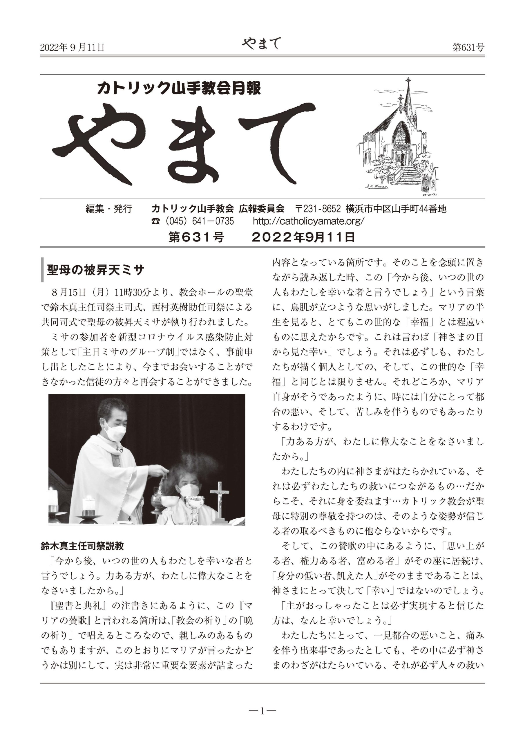 カトリック山手教会月報 『やまて』 第631号 2022年9月11日 by HomePage Administrator 教会報やまて 『やまて』 第631号 目次 巻頭(PDF) 聖母の被昇天ミサ 鈴木真主任司祭説教 2ページ 鈴木真主任司祭 主日ミサ説教 2022年7月24日 年間第17主日 C年 ルカ福音書 11章 1−13節 3ページ 新しい「ミサの式次第」実施に向けて② 主任司祭 鈴木真 4ページ 今年のカブ隊夏季活動について 5ページ ガールスカウトの夏 6ページ 2022年8月度教会委員会議事要約 8ページ 2022年9月・10月主日ミサの聖歌および奉仕者予定表 編集後記 Share